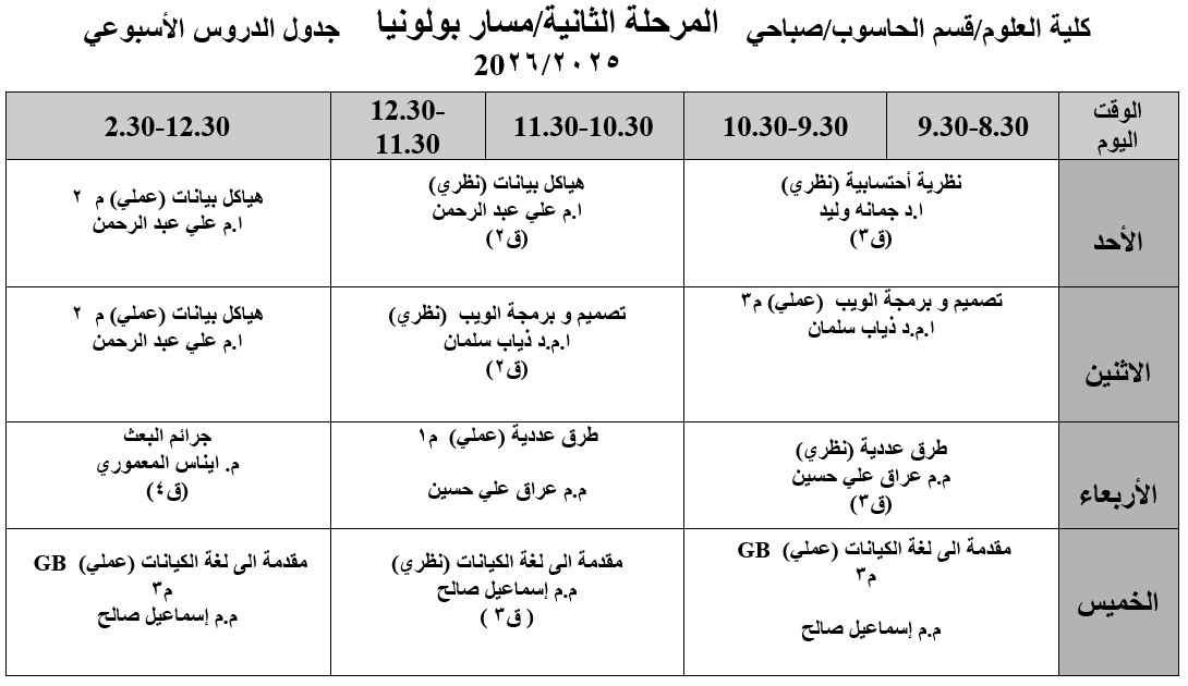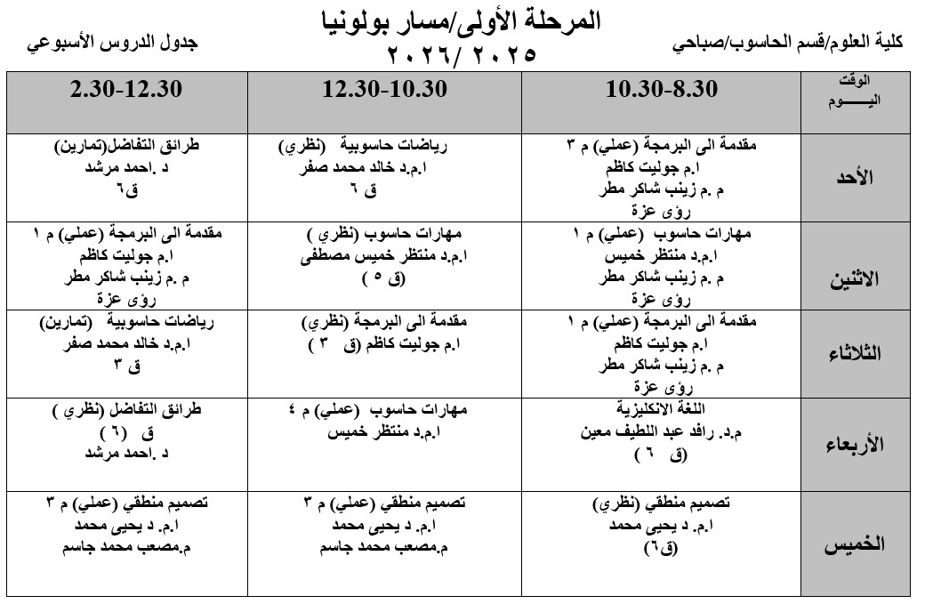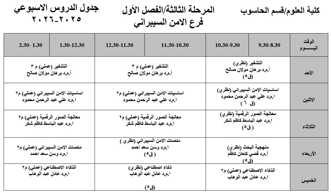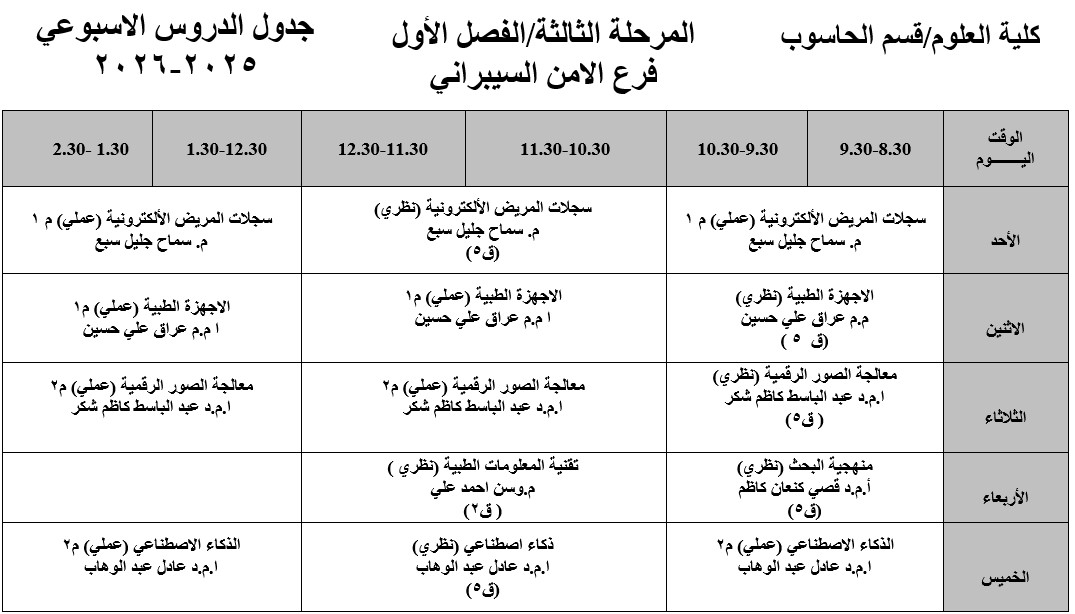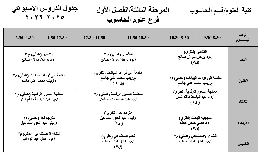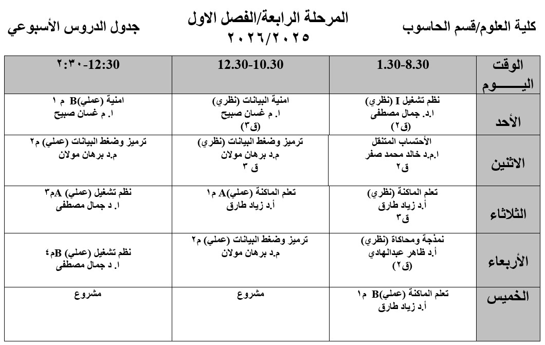 جدول المحاضرات الاسبوعي للعام الدراسي 2025-2026