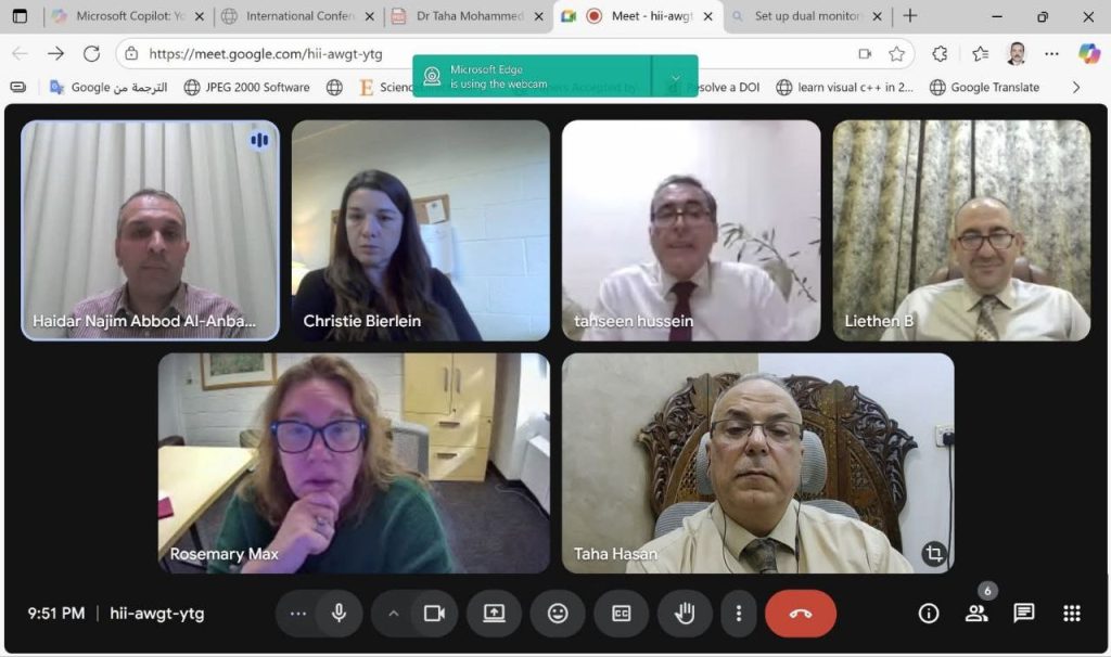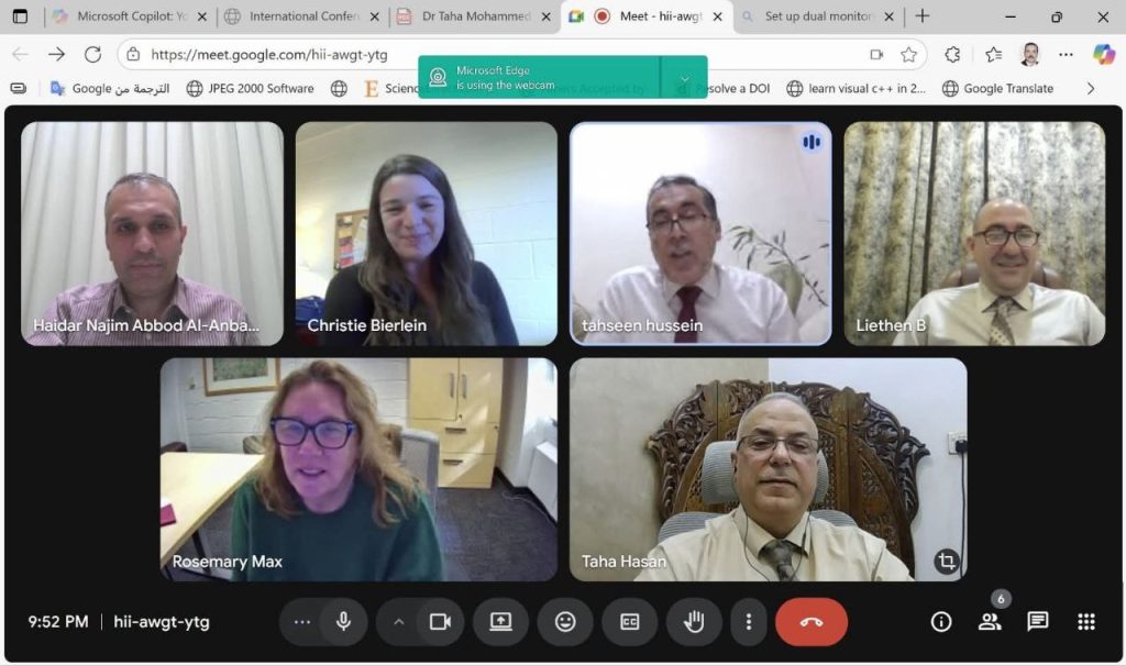 في إطار انفتاح جامعة ديالى على التعاون الدولي، شارك عميد كلية العلوم الأستاذ الدكتور طه محمد حسن المحترم ومعاون العميد للشؤون الإدارية الأستاذ الدكتور ليث عبد اللطيف المحترم في الاجتماع الافتراضي الذي عقده السيد رئيس جامعة ديالى الأستاذ الدكتور تحسين حسين مبارك المحترم مع وفد من جامعة غرب ميشيغن الأمريكية، لبحث آفاق التعاون العلمي والأكاديمي بين الجانبين.وتناول اللقاء مناقشة فرص التبادل البحثي والعلمي، وتنفيذ برامج تدريب وتطوير مشتركة، وإقامة مشاريع علمية تسهم في الارتقاء بمستوى التعليم العالي.وأكد المشاركون حرصهم على دعم جميع المبادرات التي تعزز التعاون الدولي وتطور الكفاءات الأكاديمية، بما يحقق أهداف التنمية المستدامة، ولا سيما الهدف الرابع (التعليم الجيد) والهدف السابع عشر (عقد الشراكات لتحقيق الأهداف).