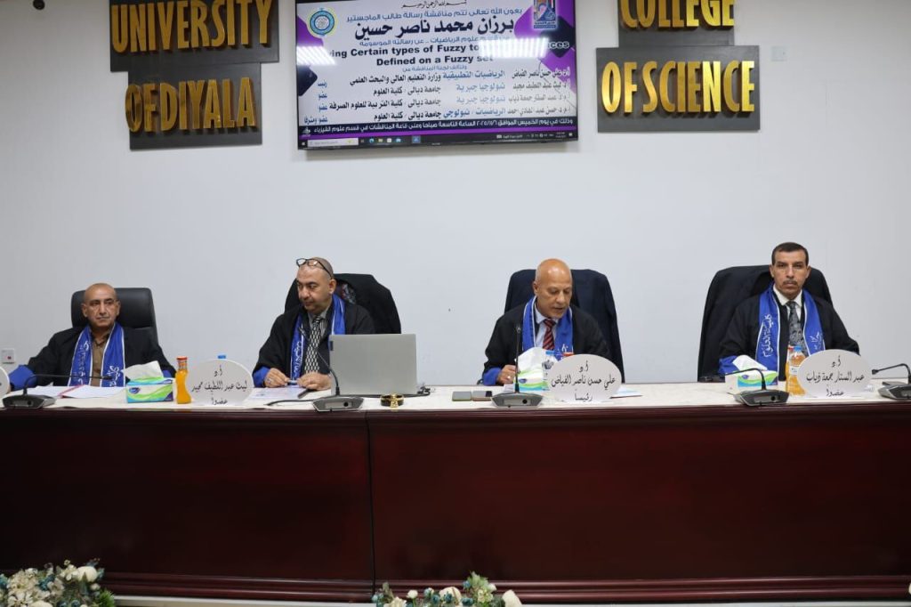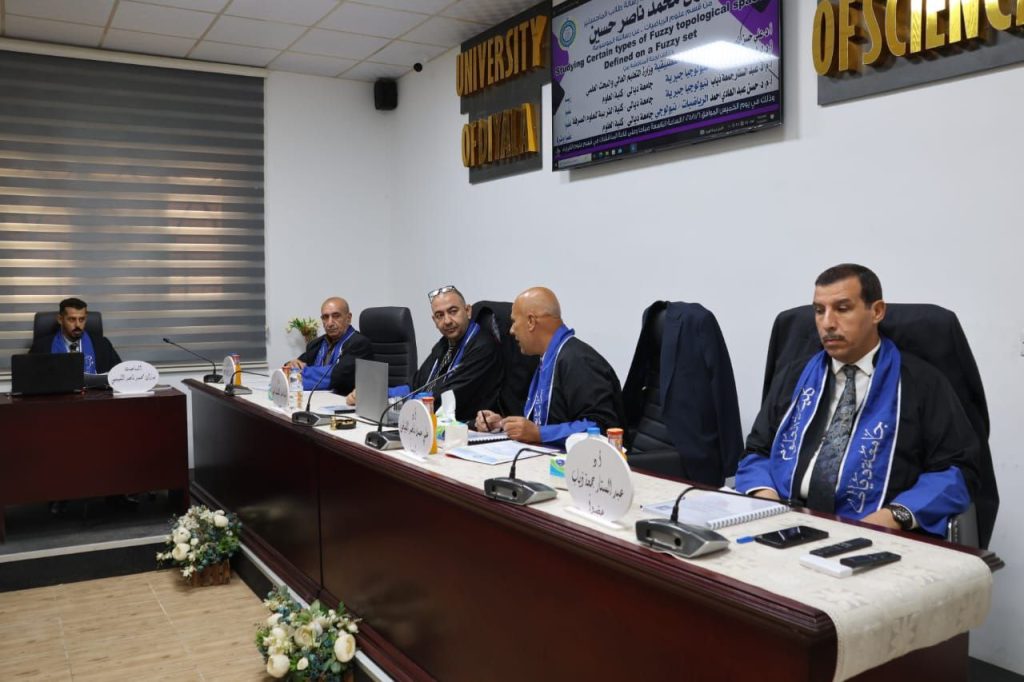بحضور عميد كلية العلوم الأستاذ الدكتور طه محمد حسن المحترم، نوقشت في قسم علوم الرياضيات بكلية العلوم في جامعة ديالى رسالة الماجستير الموسومة “دراسة أنواع معينة من الفضاءات الطوبولوجية الضبابية المعرفة على مجموعة ضبابية”، والتي قدّمها الطالب برزان محمد ناصر اللهيبي، بإشراف الأستاذ المساعد الدكتور حسن عبد الهادي أحمد الطائي.هدفت الرسالة إلى دراسة أنواع محددة من الفضاءات الطوبولوجية الضبابية والتعرّف على خصائصها وعلاقاتها المتبادلة، حيث تناول الباحث عدداً من المفاهيم الرياضية المتقدمة ضمن هذا المجال مثل الفضاءات من الأنواع f.R، f.G، f.RG، f.G* وغيرها، مع مناقشة العلاقات التي تربط بينها من حيث الاتصال والانتظام والإحاطة الموضعية.كما تطرقت الدراسة إلى بيان الخصائص الوراثية لهذه الفضاءات، فضلاً عن مناقشة صفاتها العامة وإمكانية تطبيقها في مجالات رياضية أوسع، إذ تم التركيز على العلاقة بين الفضاءات الضبابية المنتظمة والمضغوطة وفضاءات Hausdorff و locally compact.وتأتي هذه الرسالة ضمن توجه كلية العلوم بجامعة ديالى نحو تحقيق أهداف التنمية المستدامة، من خلال تعزيز البحث العلمي والابتكار في مجالات العلوم الأساسية وتطوير المعرفة الرياضية بما يسهم في دعم المسيرة الأكاديمية والعلمية.
