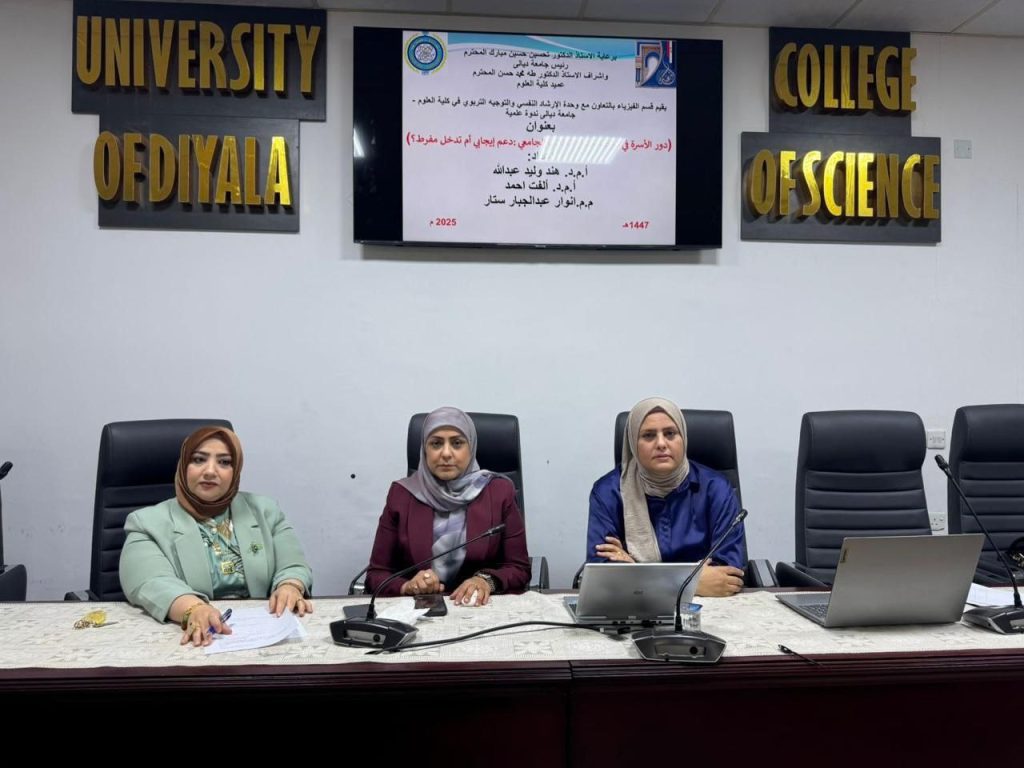 برعاية السيد رئيس جامعة ديالى الأستاذ الدكتور تحسين حسين مبارك، وبإشراف عميد كلية العلوم الأستاذ الدكتور طه محمد حسن، أقام قسم علوم الفيزياء بالتعاون مع وحدة الإرشاد النفسي والتوجيه التربوي ندوة بعنوان”دور الأسرة في توجيه مسار الطالب الجامعي: دعم إيجابي أم تدخل مفرط”، حاضر فيها كل من أ.م.د. ألفت أحمد محمود و أ.م.د. هند وليد عبد الله و م.م. أنوار عبد الجبار ستار.تناولت الندوة أهمية الدور الذي تضطلع به الأسرة في حياة الطالب الجامعي، ولا سيما في توجيه مساره الأكاديمي والمهني، إذ تُعدّ الأسرة البيئة الأولى التي تسهم في تشكيل شخصية الطالب وتؤثر في قراراته الدراسية والمستقبلية.وركزت المحاضرات على محورين أساسيين، أولهما الدعم الإيجابي المتمثل في مساندة الأسرة للطالب معنوياً ومادياً وتشجيعه على تحمّل المسؤولية واتخاذ قراراته بحرية، وثانيهما التدخل المفرط الذي يظهر عندما تفرض الأسرة رغباتها أو اختياراتها على الطالب، مما يؤدي إلى فقدانه الثقة بقدراته ويؤثر سلباً في دافعيته الدراسية.واختتمت الندوة بالتأكيد على أن تحقيق التوازن بين التوجيه والاستقلالية هو الأساس في نجاح الطالب الجامعي، من خلال بناء علاقة قائمة على الحوار والتفاهم بين الأسرة وأبنائها، وبما يسهم في تحقيق أهداف التنمية المستدامة.