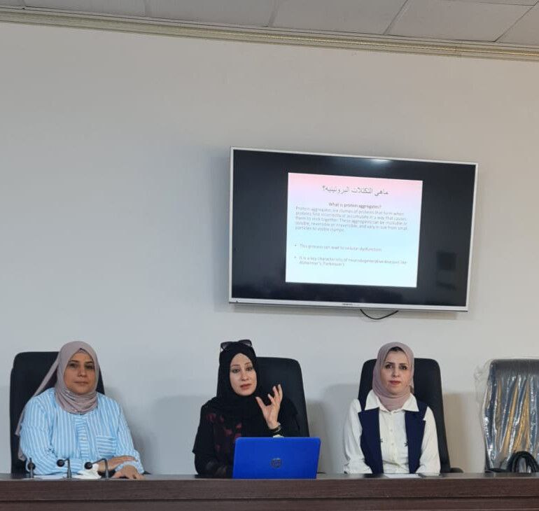 أقام قسم علوم الكيمياء في كلية العلوم بجامعة ديالى دورة تدريبية بعنوان «تقنيات كشف التكتلات البروتينية في الأمراض العصبية» حاضر فيها كل من الأستاذة نجلاء جميل حميد، م. د. ندى عبدالجليل عمران، وم. م. إخلاص أحمد عبدالكريم، وذلك على قاعة المناقشات في القسم وبمشاركة تدريسيين وطلبة من قسم الكيمياء.تضمنت الدورة محاور علمية تناولت الدور الحيوي للأغشية البروتينية في الخلايا العصبية، وأهميتها في الطب الجزيئي وتشخيص الأمراض العصبية. كما شملت شرحًا مفصلًا لآليات تكون التكتلات البروتينية وأسبابها، إضافة إلى استعراض أحدث التقنيات المستخدمة في التشخيص التصويري والتحليل المختبري لهذه الحالات ضمن الدراسات الأكاديمية.وخرجت الدورة بعدد من التوصيات العلمية، أبرزها:أهمية التشخيص الطبي المبكر والدقيق عند ملاحظة أي أعراض عصبية.اتباع نمط حياة صحي إلى جانب العلاج الموصى به، نظرًا لارتباط هذه الأمراض بتغيرات خلوية يصعب استرجاع حالتها الطبيعية في حال التأخر بالتدخل.التأكيد على أن إهمال العلاج أو التأخر فيه يؤدي إلى تفاقم الحالة المرضية، إذ يعتمد العلاج على تقليل السمية البروتينية داخل الخلايا ولا يفيد فيها التدخل الجراحي.وتأتي هذه الدورة ضمن جهود للارتقاء بمستوى الوعي العلمي لدى الطلبة وتطوير مهاراتهم في التقنيات البحثية الحديثة، بما يعزز مساهمة الكلية في دعم الهدف الثالث من أهداف التنمية المستدامة (الصحة الجيدة والرفاه) عبر تعزيز قدرات الطلبة والباحثين في مجالات التشخيص الجزيئي للأمراض العصبية.