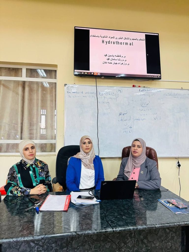 Hydrothermalأقام قسم علوم الفيزياء بالتعاون مع شعبة التعليم المستمر في كلية العلوم بجامعة ديالى دورة علمية بعنوان “التحكم بالحجم والشكل للمواد النانوية باستخدام تقنية Hydrothermal”، قدمتها كل من م.م. فاطمة ياسين محمد و م.م. زهراء جبار حمه خان و م.م. رشا سامان محمد، وبحضور عدد من الطالبات ومنتسبات الكلية من الكادرين التدريسي والوظيفي.تناولت الدورة تقنية Hydrothermal التي تُعد من أهم الطرق منخفضة الكلفة والمناسبة لإنتاج المواد النانوية مع إمكانية التحكم الدقيق في الحجم والشكل البلوري. وتعتمد هذه التقنية على استخدام محلول مائي داخل أوتوكليف مغلق عند درجات حرارة وضغوط عالية، مما يوفر بيئة ثابتة تسهم في التحكم بنمو وتبلور المواد على المستوى النانوي.كما أوضحت المحاضِرات أن التحكم بالحجم والشكل البلوري للمواد النانوية يعتمد على عدة عوامل، أبرزها: نوع وتركيز الأملاح الأولية، درجة الحرارة، الضغط، زمن التفاعل، قيمة الأس الهيدروجيني (pH)، بالإضافة إلى العوامل السطحية (surfactants) و(capping agents) التي تعمل على منع التكتل وتوجيه اتجاه النمو البلوري.وتضمنت الدورة أمثلة تطبيقية توضّح كيفية تأثير هذه العوامل، مثل زيادة درجة الحرارة وزمن التفاعل التي تؤدي إلى نمو بلورات أكبر، أو تغيير قيمة pH الذي ينتج عنه أشكال نانوية مختلفة كالقضبان والأنابيب والصفائح والجسيمات الكروية.وبيّنت الدورة أن تقنية Hydrothermal تمتاز بإمكانية إنتاج مواد نانوية عالية النقاوة ومتجانسة، وبخصائص مورفولوجية وبلورية مضبوطة تجعلها مناسبة للاستخدام في مجالات التحفيز، والطاقة، والطب، وأجهزة الاستشعار.تسهم هذه الدورة في دعم الهدف الرابع (التعليم الجيد) من خلال تطوير المهارات العلمية للطلبة، والهدف التاسع (الصناعة والابتكار والهياكل الأساسية) عبر تعزيز المعرفة بالتقنيات المتقدمة في تصنيع المواد النانوية، مما يعزز دور الجامعة في الابتكار والبحث العلمي المستدام.