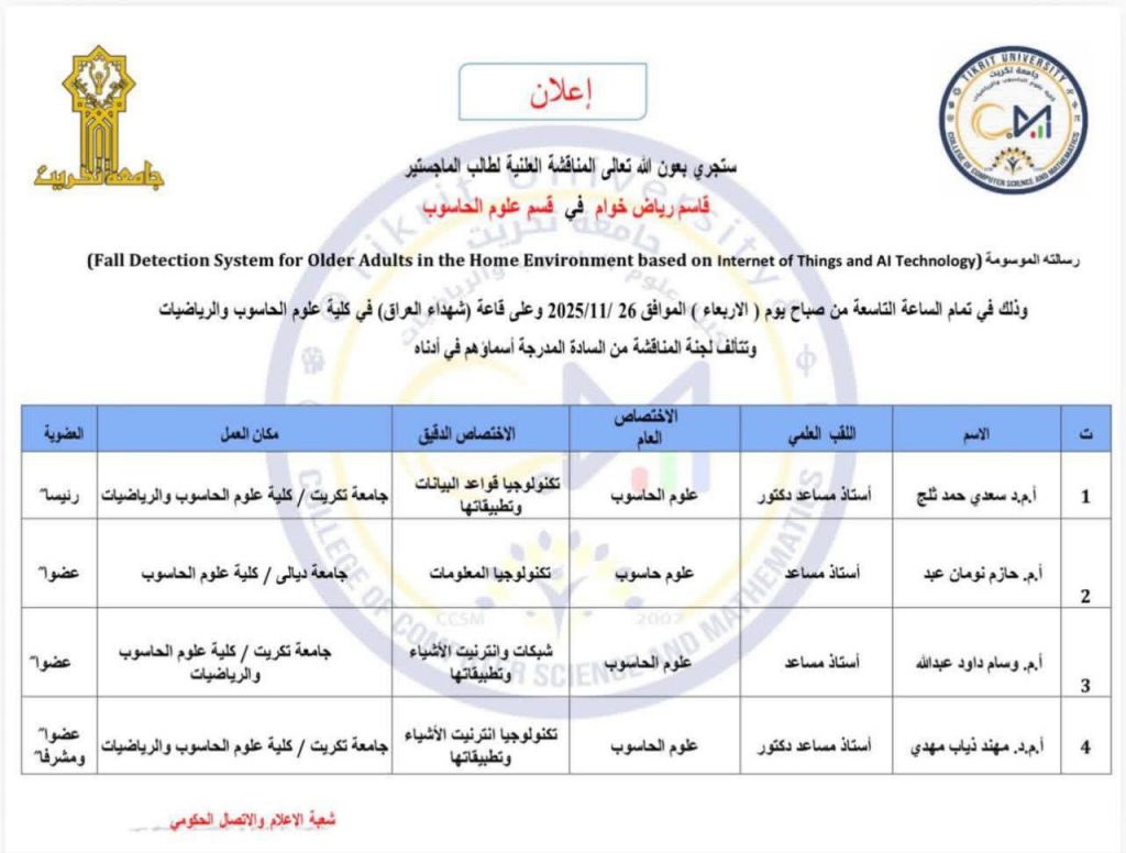 ضمن نهج كلية العلوم في جامعة ديالى ودعمها المستمر لمسيرة البحث العلمي وتعزيز الشراكات الأكاديمية بين الجامعات العراقية، شارك التدريسي في قسم علوم الحاسوب الأستاذ المساعد حازم نومان عبد عضواً في لجنة مناقشة رسالة الماجستير المقدّمة من الطالب قاسم رياض خوام في قسم علوم الحاسوب بكلية علوم الحاسوب والرياضيات – جامعة تكريت.وجاءت الرسالة بعنوان:”Fall Detection System for Older Adults in the Home Environment Based on Internet of Things and AI Technology”والتي هدفت إلى تطوير نظام ذكي قادر على اكتشاف حالات السقوط لدى كبار السن داخل البيئة المنزلية، بالاعتماد على تقنيات إنترنت الأشياء والذكاء الاصطناعي، وبالأخص خوارزميات التعلم العميق، بما يسهم في تعزيز الرعاية الصحية الذكية وتحسين جودة حياة كبار السن.وتأتي مشاركة تدريسيي كلية العلوم في مثل هذه اللجان انسجاماً مع توجهات الجامعة في تحقيق أهداف التنمية المستدامة عبر دعم البحث العلمي، وتبادل الخبرات، وتعزيز التعاون الأكاديمي بين المؤسسات التعليمية.