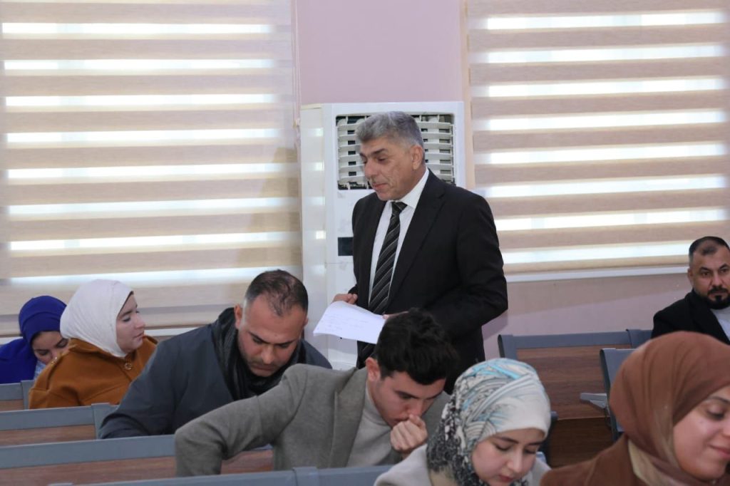 قام السيد عميد كلية العلوم الأستاذ الدكتور طه محمد حسن المحترم يرافقه معاون العميد للشؤون العلمية الأستاذ الدكتور منذر حمزة راضي، بجولة تفقدية لسير الامتحانات النهائية لطلبة الدراسات العليا (الفصل الدراسي الأول) للعام الدراسي الحالي.وشملت الجولة قاعات الامتحانات في أقسام الكلية المختلفة، حيث اطمأن العميد على انتظام العملية الامتحانية، وتوفر الظروف المناسبة للطلبة لأداء امتحاناتهم بيسر وطمأنينة. كما استمع لملاحظات الطلبة واستفساراتهم، مؤكداً على تذليل كل الصعوبات التي قد تواجههم.وأشاد العميد بالجهود الكبيرة التي يبذلها الأساتذة والكوادر الإدارية والفنية في إنجاح العملية الامتحانية، مشدداً على أهمية التقييم العلمي الدقيق كأساس لتطوير المنظومة التعليمية والبحثية في الكلية.وفي إطار التزام الكلية برسالتها المجتمعية والعلمية، تجسد هذه المتابعة الميدانية المستمرة لسير الامتحانات تحقيقاً لأحد أهداف التنمية المستدامة (الهدف الرابع: التعليم الجيد)، الذي يؤكد على ضمان تكافؤ فرص التعليم الجيد وتعزيز فرص التعلم مدى الحياة للجميع. حيث تعمل الكلية على تأمين بيئة تعليمية محفزة وعادلة، وضمان جودة عمليات التقييم لبناء قدرات الطلبة وإعداد كوادر علمية قادرة على الإسهام في تنمية المجتمع.