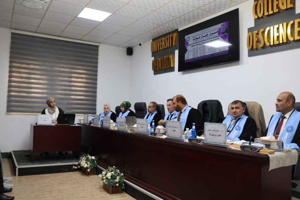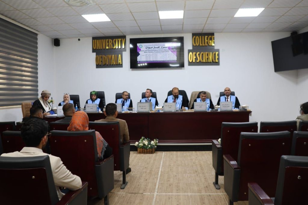 أجريت في قسم علوم الفيزياء بكلية العلوم في جامعة ديالى مناقشة أطروحة دكتوراه للباحثة أسرار جبار موات والموسومة:(تحضير وتوصيف جسيمات الزنك–الكروم النانوية لتطبيقات معالجة المياه الصحية)وتهدف الأطروحة إلى تحضير ودراسة خصائص جسيمات نانوية مزدوجة الهيدروكسيد الطبقي (LDHs) من نوعي Zn-Cr و Ni-Al باستخدام تقنيات الترسيب المشترك والمعالجة الحرارية عند درجات حرارة مختلفة، مع توصيفها من حيث البنية التركيبية، والخواص المورفولوجية، والبصرية، وتوزيع حجم الجسيمات، وكذلك دراسة تأثير المعالجة الحرارية على كفاءة المواد المحضّرة في معالجة المياه الصحية.وشملت الدراسة استخدام عدة تقنيات تحليلية متقدمة مثل حيود الأشعة السينية (XRD)، ومطيافية الأشعة تحت الحمراء (FT-IR)، والمجهر الإلكتروني الماسح (FE-SEM)، ومجهر القوة الذرية (AFM)، لتحديد البنية البلورية وحجم الجسيمات وخصائص سطحها، مع توضيح التوزيع المكاني للجسيمات وتأثير المعالجة الحرارية على تحسين أدائها.وتأتي هذه الأطروحة ضمن نشاطات الدراسات العليا في كلية العلوم – جامعة ديالى، بما يسهم في تحقيق أحد أهداف التنمية المستدامة، وبالأخص الهدف السادس: المياه النظيفة والنظافة الصحية، من خلال تطوير مواد فعالة لمعالجة المياه وتحسين نوعيتها.