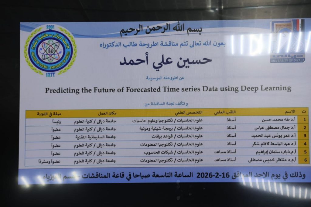ترأس السيد عميد كلية العلوم في جامعة ديالى الأستاذ الدكتور طه محمد حسن المحترم لجنة مناقشة أطروحة الدكتوراه الموسومة (التنبؤ بمستقبل بيانات السلاسل الزمنية المتوقعة باستخدام التعلم العميق) والمقدمة إلى قسم علوم الحاسبات في كلية العلوم، والتي تقدّم بها الباحث حسين علي أحمد، وذلك بحضور عدد من التدريسيين والباحثين وطلبة الدراسات العليا.هدفت الأطروحة إلى بناء نماذج تنبؤية تعتمد على تقنيات التعلم العميق لمعالجة بيانات السلاسل الزمنية، ولاسيما في مجال استهلاك الطاقة، من خلال توظيف شبكتي الذاكرة طويلة قصيرة الأمد (LSTM) ووحدة البوابات المتكررة (GRU)، لما لهما من قدرة عالية على التقاط الأنماط الزمنية المعقدة ومعالجة مشكلات فرط التكيّف وتحسين دقة التنبؤ.وتضمنت الدراسة مراحل متعددة شملت المعالجة المسبقة للبيانات، وتنظيفها، وتحليلها إحصائياً، فضلاً عن تقييم أداء النماذج باستخدام مقاييس الدقة (Accuracy) والإحكام (Precision) والاسترجاع (Recall) ودرجة (F1). وأظهرت النتائج تفوق نموذج (LSTM) في جميع الأطر الزمنية، إذ حقق دقة بلغت (97%) على المستوى الأسبوعي والشهري، فيما بلغت الدقة (98%) على المستوى اليومي، مع قيم مرتفعة لمقياس (F1)، مما يعكس كفاءة النموذج في التنبؤ واستخدامه في تطبيقات المدن الذكية وإدارة الطاقة.وفي ختام المناقشة، أشادت اللجنة بالجهود العلمية المبذولة في الأطروحة، مؤكدة أهمية توظيف تقنيات الذكاء الاصطناعي في معالجة المشكلات الواقعية ودعم خطط التنمية المستدامة، ولاسيما ما يتعلق بتعزيز كفاءة استهلاك الطاقة وتحسين إدارتها، وبما يسهم في تحقيق الهدف السابع من أهداف التنمية المستدامة المعني بالطاقة النظيفة وبأسعار معقولة.