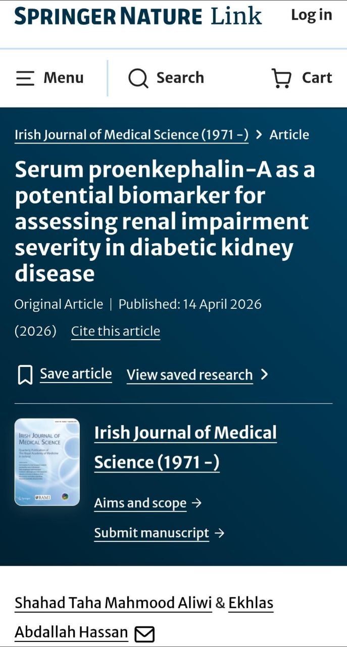 نشر فريق بحثي من قسم علوم الكيمياء في كلية العلوم بجامعة ديالى مؤلف كل من الأستاذة الدكتورة إخلاص عبدالله حسن، التدريسية في القسم و طالبة الماجستير شهد طه محمود عليوي، بحثًا علميًا عالميًا بعنوان:(سيرم بروإنكيفالين-إيه كمؤشر حيوي محتمل لتقييم شدة القصور الكلوي في اعتلال الكلية السكري)،في المجلة الأيرلندية للعلوم الطبية التابعة لدار النشر العالمية سبرنغر نيتشر، والمفهرسة ضمن قواعد بيانات سكوبس وكلاريفيت (ويب أوف ساينس)، والمصنّفة ضمن الربع الأول (Q1) في مجال الطب العام.وتناول البحث دراسة بروتين بروإنكيفالين-إيه (PENK-A) بوصفه مؤشرًا حيويًا حديثًا لتقييم شدة التدهور في وظائف الكلى لدى مرضى السكري المصابين باعتلال الكلية السكري، مع تحليل علاقته بالتغيرات النسيجية المرضية.وأظهرت النتائج ارتفاع مستويات هذا المؤشر بشكل ملحوظ لدى المرضى، خاصة في الحالات المتقدمة، مع وجود ارتباط وثيق بين ارتفاعه وعدة عوامل مرضية، من بينها مدة الإصابة بمرض السكري، واعتلال الشبكية السكري، والبيلة الألبومينية، إضافة إلى تدهور وظائف الكلى.وتُعد الأستاذة الدكتورة إخلاص عبدالله حسن من الباحثين المتخصصين في مجال الكيمياء الحياتية، إذ تتركز أبحاثها على دراسة المؤشرات الحيوية الجزيئية وتطبيقاتها السريرية في الأمراض المزمنة، مع السعي لفهم الآليات المرضية وربطها بالمؤشرات البايوكيميائية بهدف تحسين التشخيص المبكر والتنبؤ بتطور المرض، لا سيما في أمراض الكلى واضطرابات الغدد الصماء والإجهاد التأكسدي.ويُعد هذا الإنجاز إضافة نوعية إلى مسيرة كلية العلوم وجامعة ديالى في النشر العلمي العالمي، ويعكس المستوى المتقدم الذي وصلت إليه كلية العلوم في مجال البحث العلمي، بما يسهم في تحقيق أحد أهداف التنمية المستدامة، ولا سيما الهدف الثالث المتعلق بالصحة الجيدة والرفاه.الروابط أدناه للبحث والباحثة الأستاذة الدكتورة إخلاص عبدالله:https://doi.org/10.1007/s11845-026-04397-w�https://www.scopus.com/authid/detail.uri?authorId=57211404521�