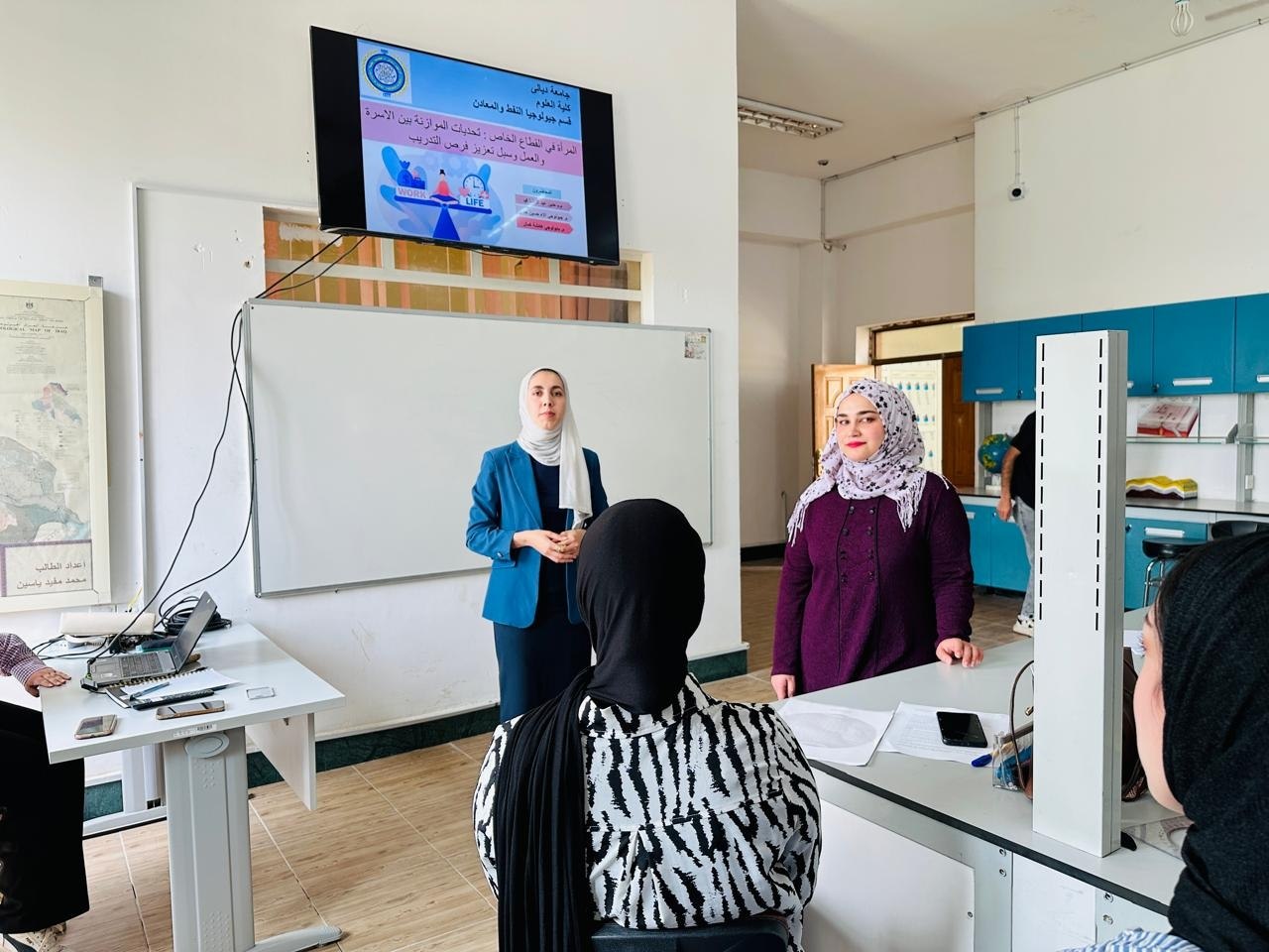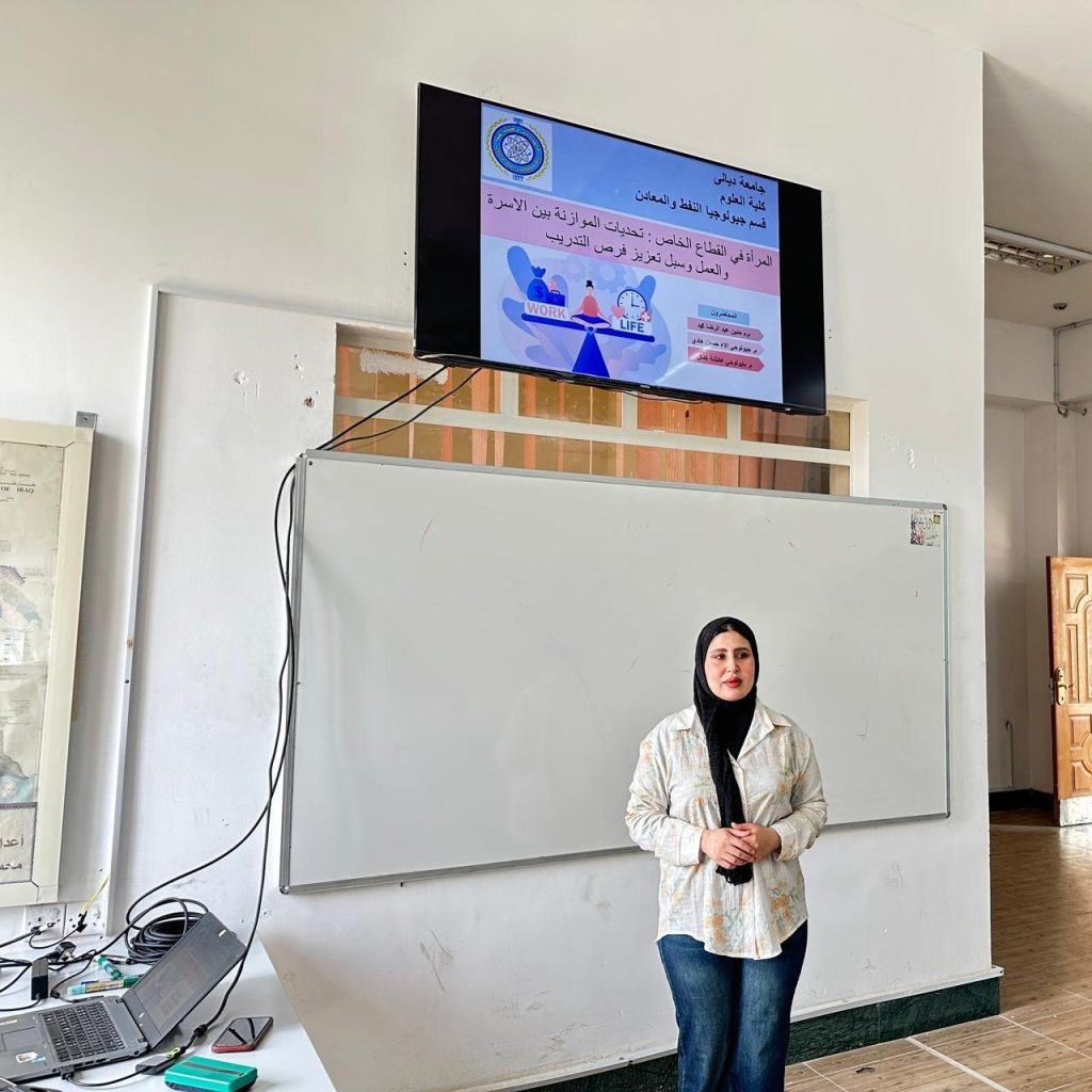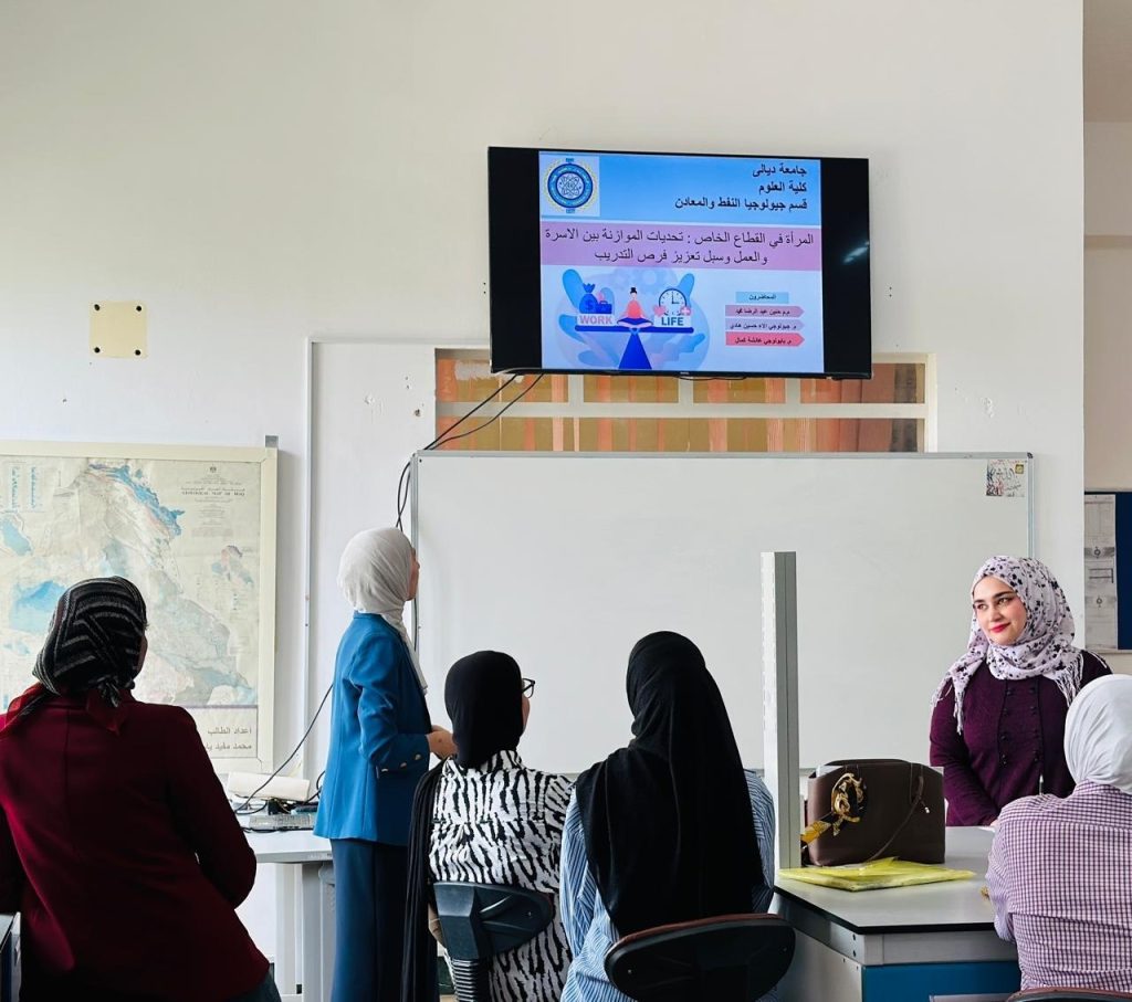 نظّم قسم جيولوجيا النفط والمعادن بالتعاون مع وحدة شؤون المرأة في كلية العلوم بجامعة ديالى ندوة علمية بعنوان “المرأة في القطاع الخاص: تحديات الموازنة بين الأسرة والعمل وسبل تعزيز فرص التدريب”، وذلك ضمن الأنشطة الهادفة إلى دعم دور المرأة وتمكينها مهنياً.هدفت الندوة إلى تسليط الضوء على أبرز التحديات التي تواجه المرأة العاملة في القطاع الخاص، ولا سيما ما يُعرف بإشكالية التوازن بين متطلبات العمل والأسرة (العمل المزدوج)، حيث تواجه المرأة ضغوطاً ناتجة عن ساعات العمل الطويلة ومتطلبات الحياة الأسرية، الأمر الذي قد يؤدي إلى استنزاف طاقاتها وانعكاسه على استمرارية مسيرتها المهنية، إضافة إلى ما يُعرف بـفجوة التطوير وتكافؤ فرص التدريب نتيجة محدودية الوقت وضعف السياسات الداعمة للتأهيل المستمر.وتناولت الندوة مجموعة من الحلول المقترحة لتعزيز بيئة العمل الداعمة للمرأة، من أبرزها اعتماد أنظمة العمل المرن والعمل عن بُعد، وتوفير حضانات داخل بيئة العمل، وتطبيق قانون العمل بما يضمن حقوق المرأة، إضافة إلى تطوير برامج التدريب الإلكتروني والمدمج، وتعزيز الشراكات مع الجامعات لتأهيل الطالبات قبل دخول سوق العمل.وأكدت الندوة أهمية تبني سياسات مؤسسية عادلة تسهم في تمكين المرأة من تحقيق التوازن بين حياتها المهنية والأسرية، بما يعزز من مشاركتها الفاعلة في سوق العمل ويدعم استدامة التنمية الاقتصادية.وفي ختام الندوة، تم التأكيد على أن هذه الجهود تأتي في إطار تحقيق الهدف الخامس من أهداف التنمية المستدامة (المساواة بين الجنسين وتمكين جميع النساء والفتيات).