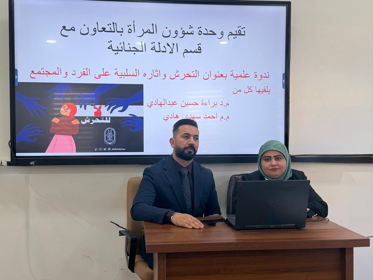 انطلاقًا من التزام كلية العلوم بجامعة ديالى بترسيخ بيئة تعليمية آمنة تقوم على الاحترام المتبادل وصون الكرامة الإنسانية، نظمت وحدة شؤون المرأة بالتعاون مع قسم الأدلة الجنائية ندوة علمية بعنوان “التحرش وآثاره السلبية على الفرد والمجتمع”، حاضر فيها كل من …